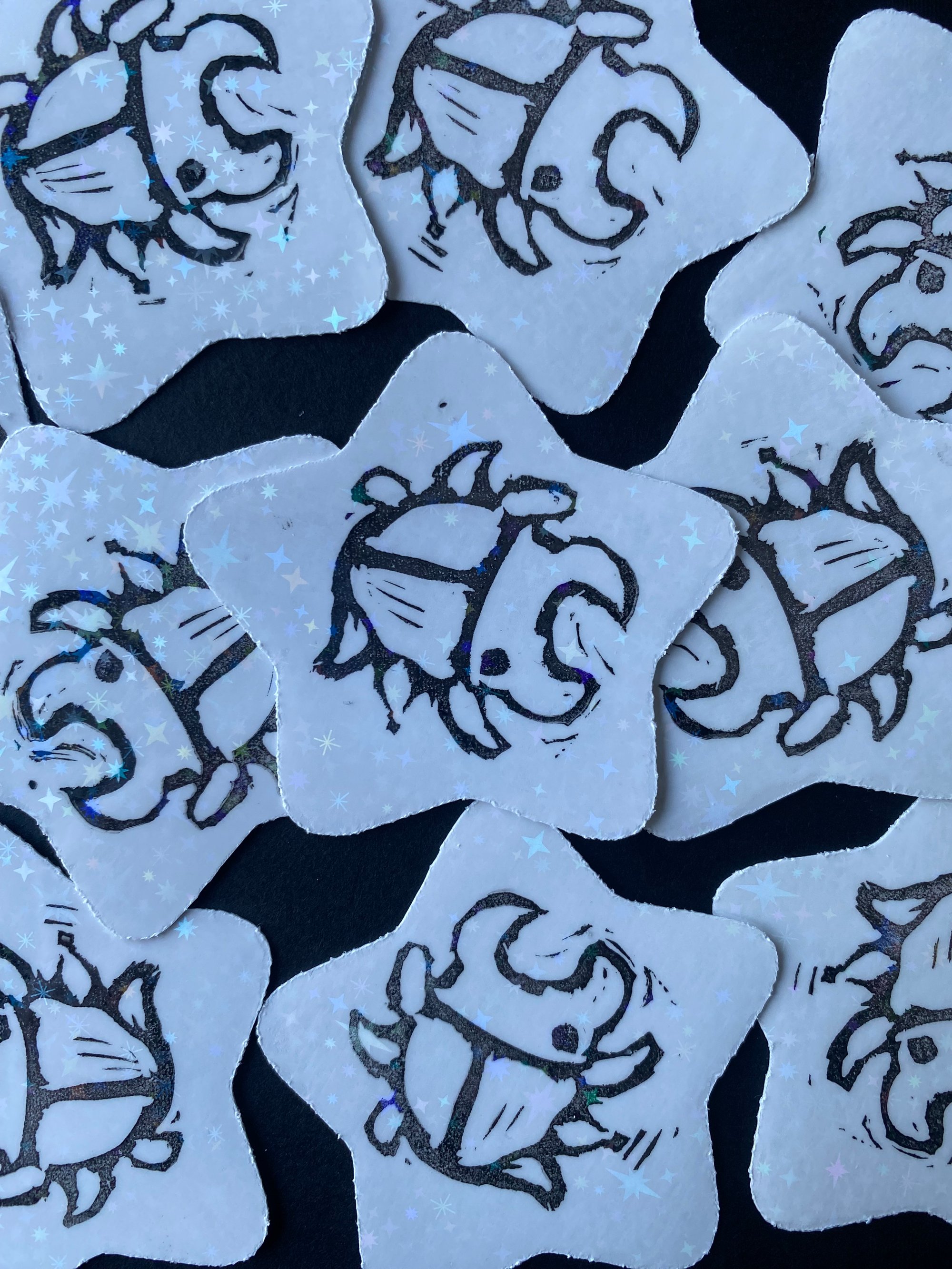Handmade beetle stickers created using linocut printing. The stickers are made with water-resistant vinyl and are highly adhesive. They are covered in a sparkly gloss finish.